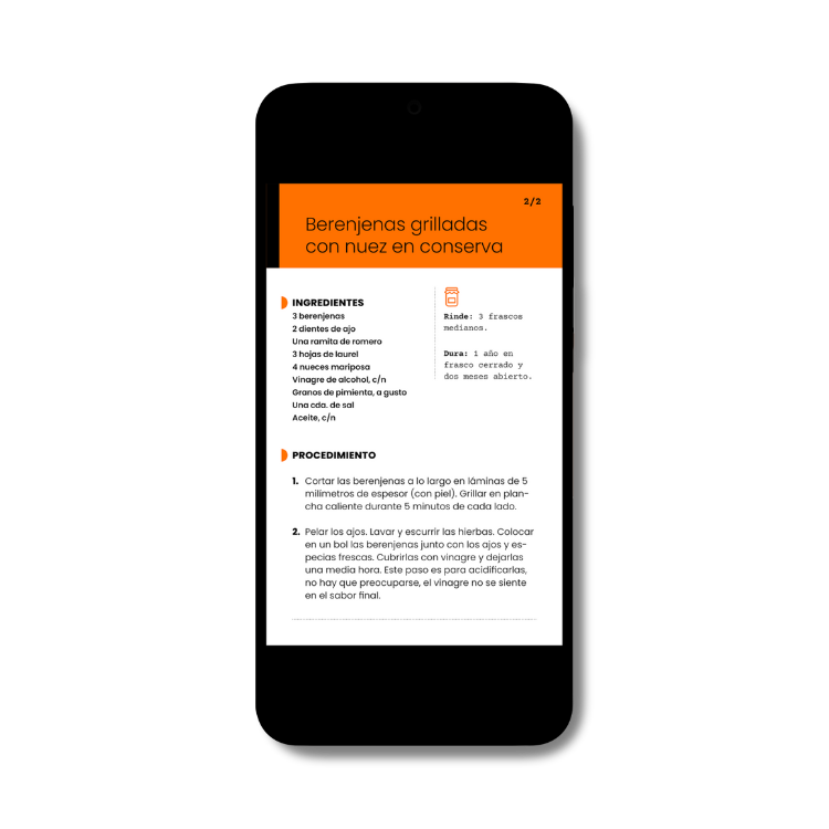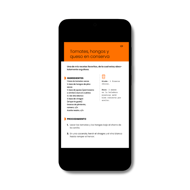 En este ebook ella busca que te enamores del arte -y de la ciencia- de las conservas, contadas de la forma más simple. Con años de experiencia llenando los muebles de su cocina con frascos, Giselle te comparte recetas reales, tips de seguridad, y secretos de abuela con rigor técnico, sin perder el amor y la simpleza en la explicación.